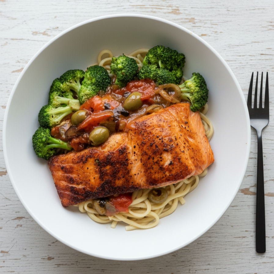 The Linguine Love Triangle: Salmon, Capers & Olives “PUTTANESCA”