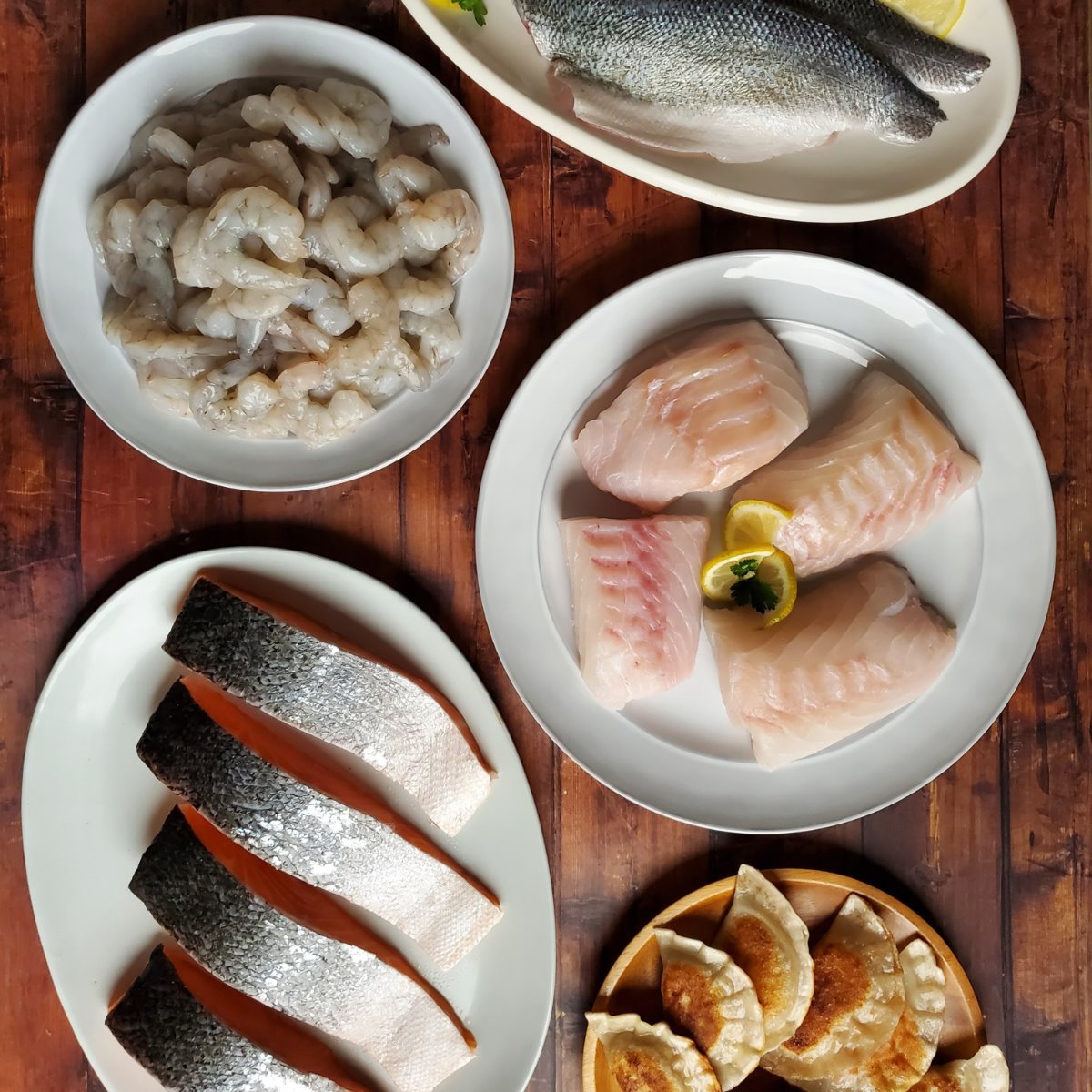 Seafood Party: 4pc Wild Alaskan Sockeye Salmon 6oz 4pc Branzini Fillet 5oz 4pc Pacific Cod Loin 4oz 1 Bag  Large Cleaned Shrimp(26/30) 2lbs 12pc Lobster Dumplings